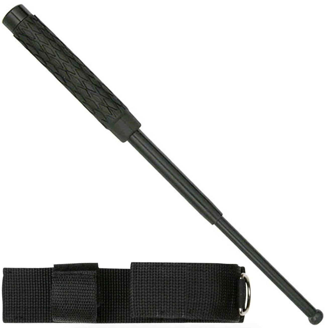 Compact, powerful and easily deployed, this impact baton quickly extends with a simple flick of the wrist. It offers superb balance and control, and a rounded impact point that effectively repels attackers without inflicting cuts. This handy deterrent provides the carrier with confidence in knowing he or she is capable of warding off any would-be assailant. Built to last, it's constructed from heavy duty black steel and has a rubberized, ridged handle for a superior grip. A heavy duty nylon pouch is included.