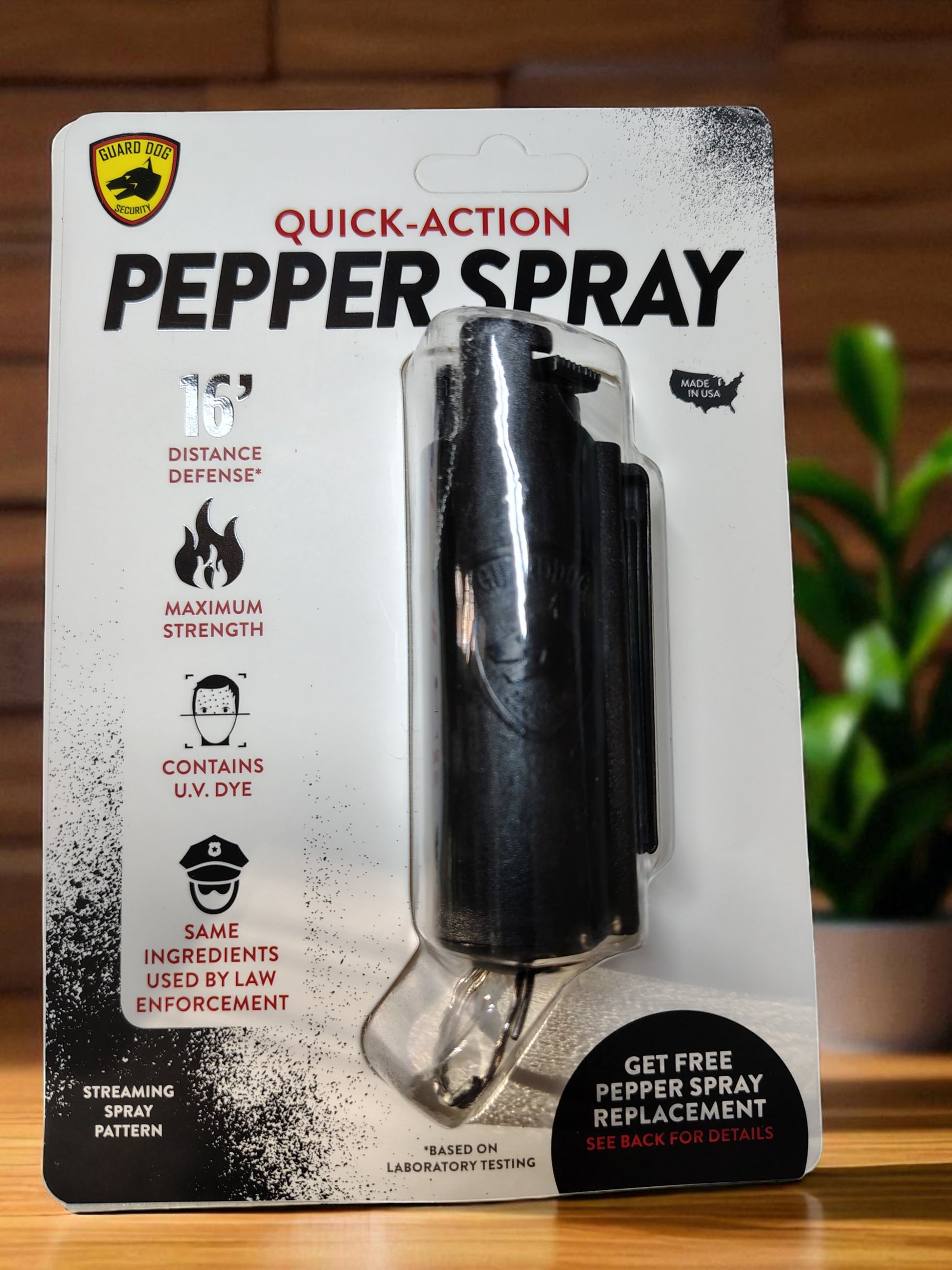 The Guard Dog 1/2 ounce hard case pepper spray makes security and protection convenient, safe, effective and appealing. The powerful 18% OC (red pepper) ingredient is concentrated to quickly immobilize an assailant and prevent a violent attack from up to 12 feet away. The hard case keychain design allows for direct use from the housing with a quick, twist-top actuator and safety slide to prevent accidental discharge. Labratory tested, anti-leak formula for optimum assurance.
