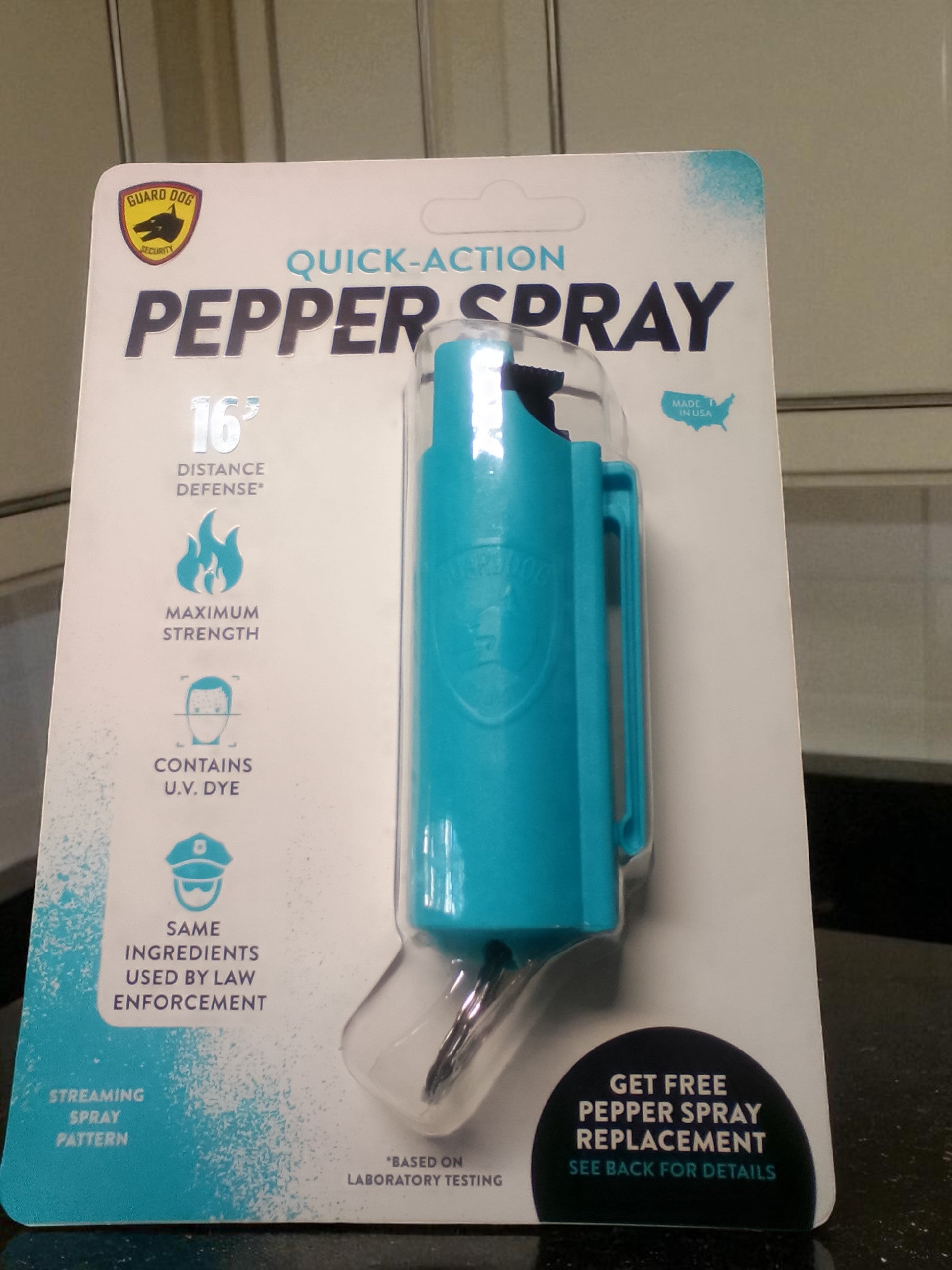 The Guard Dog 1/2 ounce hard case pepper spray makes security and protection convenient, safe, effective and appealing. The powerful 18% OC (red pepper) ingredient is concentrated to quickly immobilize an assailant and prevent a violent attack from up to 12 feet away. The hard case keychain design allows for direct use from the housing with a quick, twist-top actuator and safety slide to prevent accidental discharge. Labratory tested, anti-leak formula for optimum assurance.