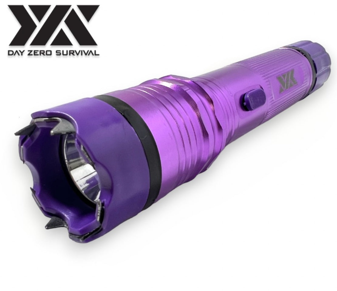 - New Day Zero Survival Flash Light Stun gun 10 Million Volt Heavy Duty Stun Gun With LED Flashlight. First device of its kind, combining 180-lumen tactical field light with added security of a 10 Million Volt Stun gun. Type III aircraft grade aluminum alloy body with anti-roll design; 100,000-hour bulb. Compact Size: 6.75" Built in LED Flashlight. Rechargeable Battery - No expensive batteries to buy.