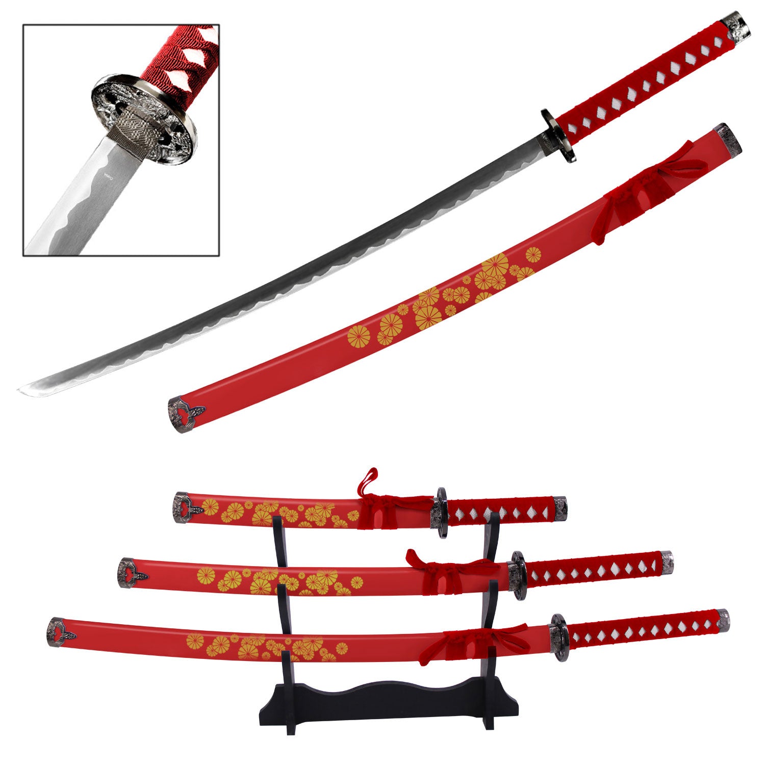 Vibrant Flower Japanese Samurai Katana Sword Set with Stand Red
